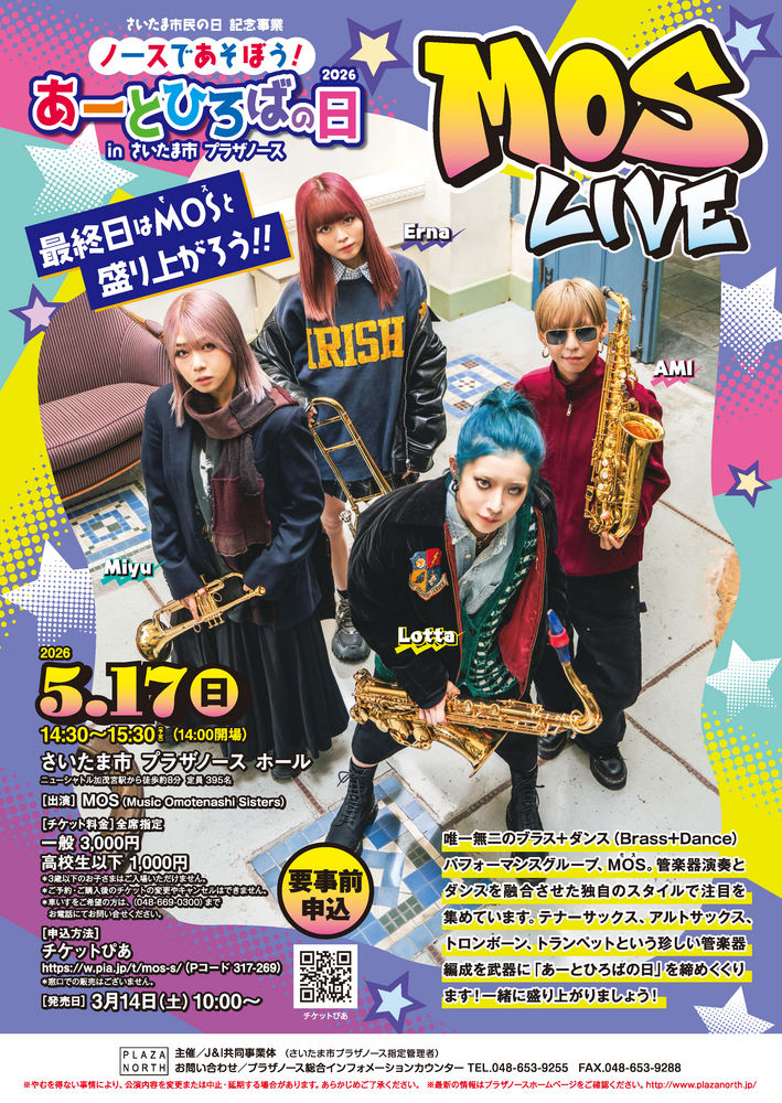 さいたま市民の日 記念事業 ノースであそぼう! あーとひろばの日 in さいたま市 プラザノース SCHEDULE 2026/05/17(日) 🗓️2026年5月17日(日) 📍さいたま市 プラザノース⏰OPEN 14:00 / START 14:30🎫一般¥3000/高校生以下¥10003月14日より販売開始!チケット購入:要事前予約必須! URLをコピーする 報告する